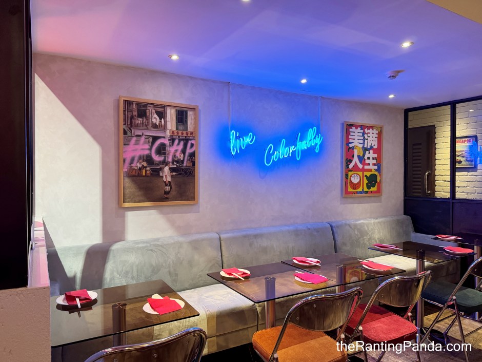 In collaboration with chefs Benji Chew and Renee Tang, the interior of the restaurant is a colour-filled retro-chic atmosphere of a Chinese salon of the 60s. There are both indoor and outdoor seats.