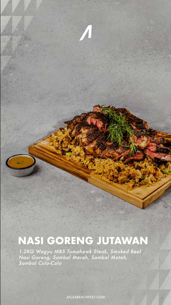 Indulge in an extraordinary culinary journey with Atlas Beach Club’s standout dish – Nasi Goreng Jutawan. This lavish take on Indonesian Nasi Goreng features a massive 1.25 kg Wagyu MB5 Tomahawk steak, served with Sambal.