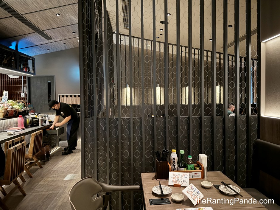 The interior of the restaurant is dim, and it exudes a modern izakaya ambience. Japanese elements are kept intact, like wooden flooring and low tables and chairs.