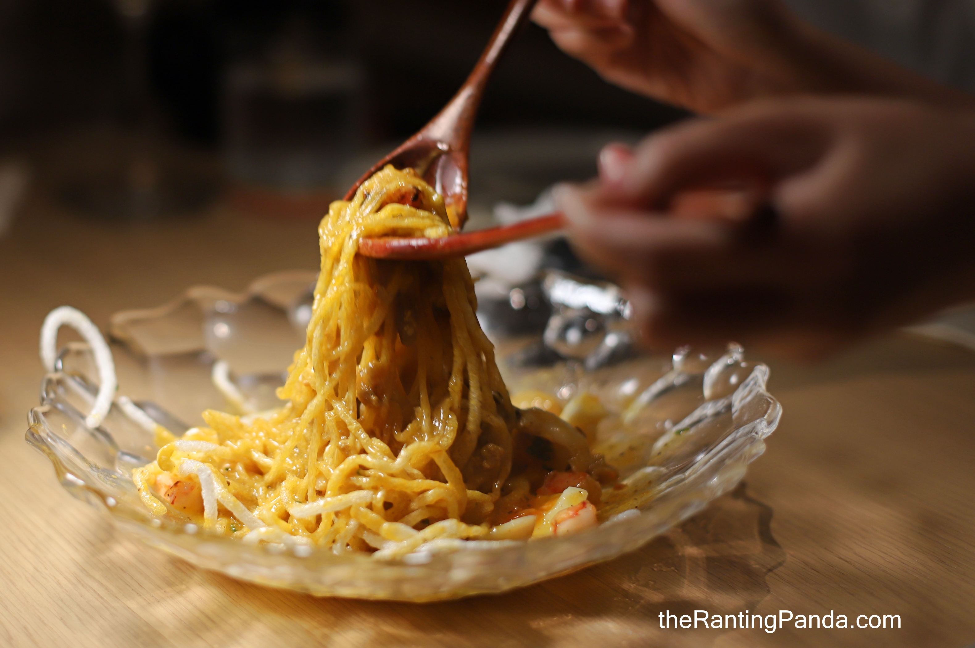 Upon serving, shrimp and annatto sauce is poured over the noodles, where the noodles then crumbled almost instantly into soft noodles in a savoury yellow broth.