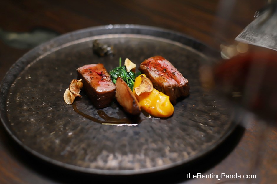 The Grilled Wagyu (和牛, Japanese beef short rib) is first braised and slow-cooked in miso, then grilled, smoked, and sliced. It is served with Taiwanese Pingtung pumpkin and Maqaw (山胡椒, mountain pepper) jus.