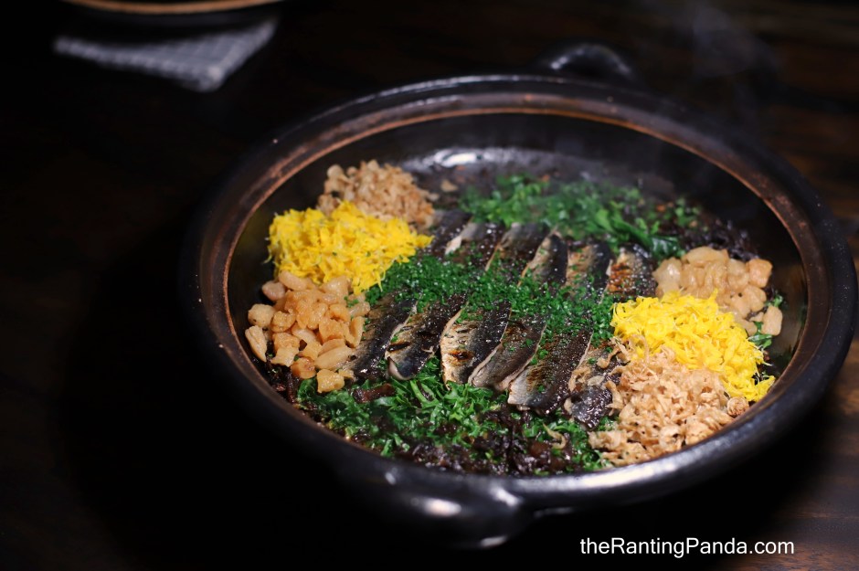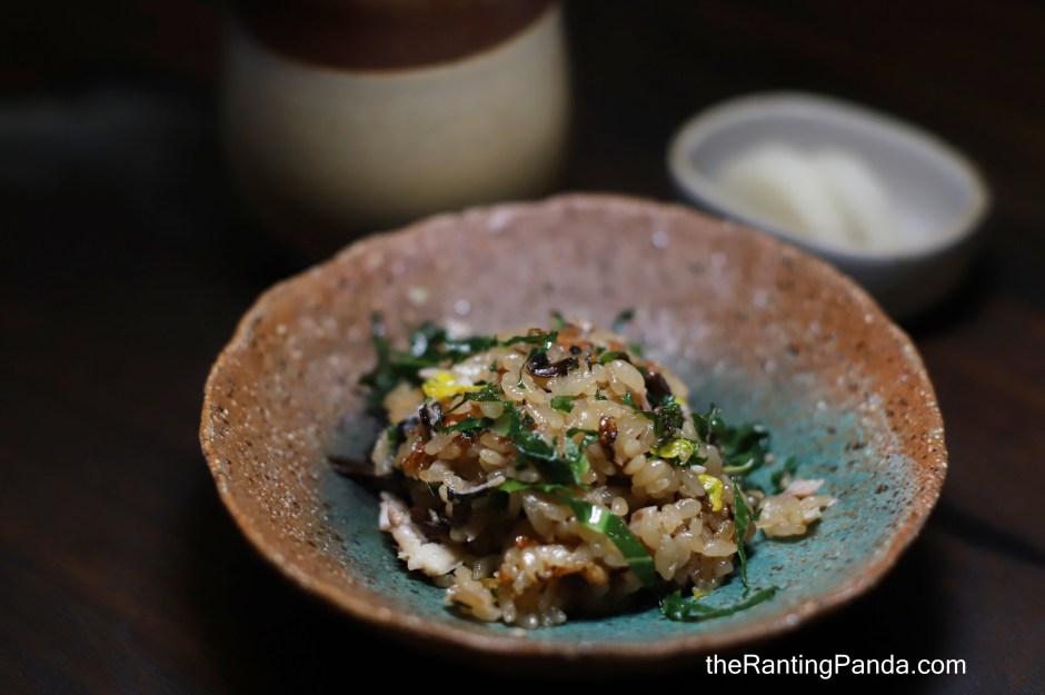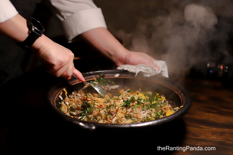 The final cooking takes place in a claypot with rice of Yumepirika rice from Hokkaido, and served with ginger, garlic, mushroom, pork lard and kale.