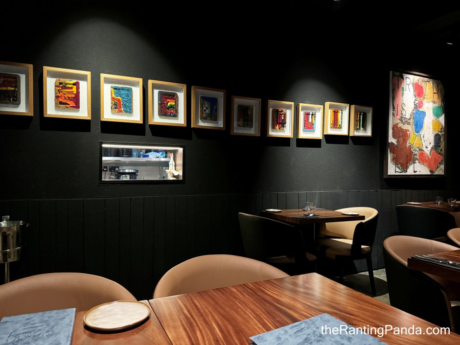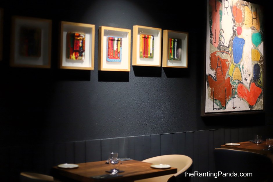 The dining ambience is dim and well-suited for a gastrobar, featuring darkened walls and wood paneling. There is also a curated gallery of eye-catching contemporary art by prominent Filipino artists Jayson Oliveria and Nilo Ilarde.