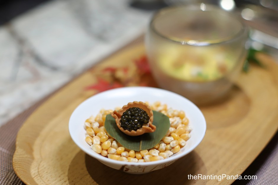 I had the ala carte menu and my meal started with the Japanese Sweet Corn Soup (S$18) topped with crouton, and it comes with a Caviar Tartlet as well.