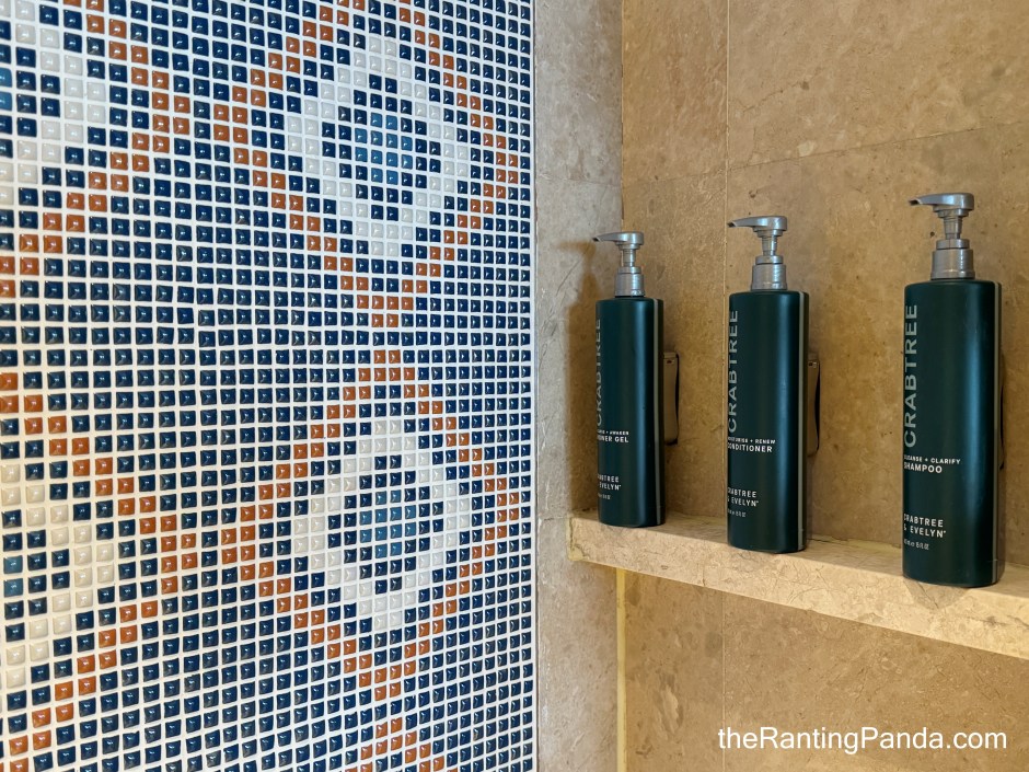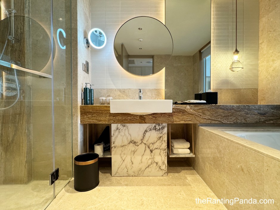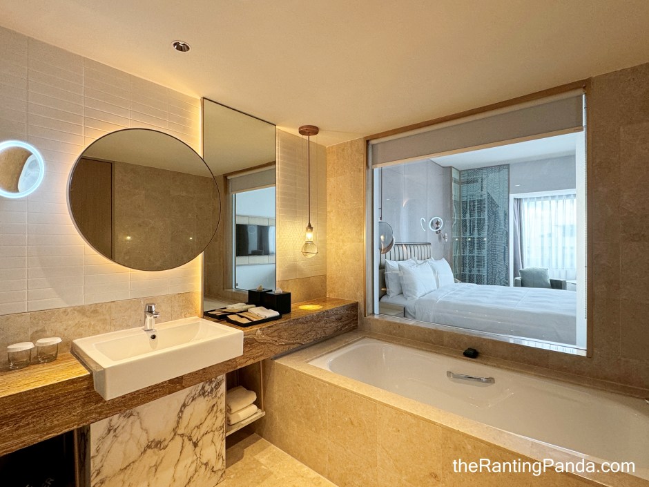 The bathroom is huge and comes with a standing shower zone and bathtub. It also overlooks the room should you not want to keep the blinds down.