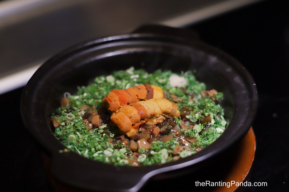 For starches, I had the Braised Sea Cucumber, Seasonal Uni, Scallion (S$108) (Option to top up 30g Uni: +S$40). A generous serving good for 3-4 pax, the charcoal-cooked claypot rice is topped with tender braised sea cucumber, slow-cooked in a rich consommé of pork hocks, duck, and chicken. Finished with spring onion and a generous serving of seasonal Uni.