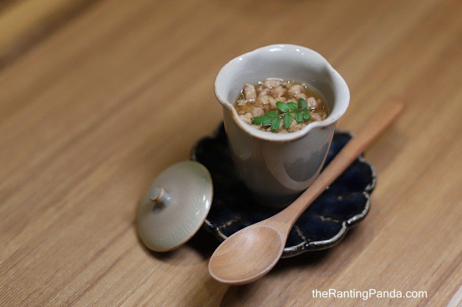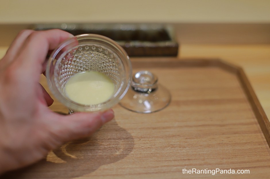 A mini bowl of chawanmushi which is prepared with chicken stock.