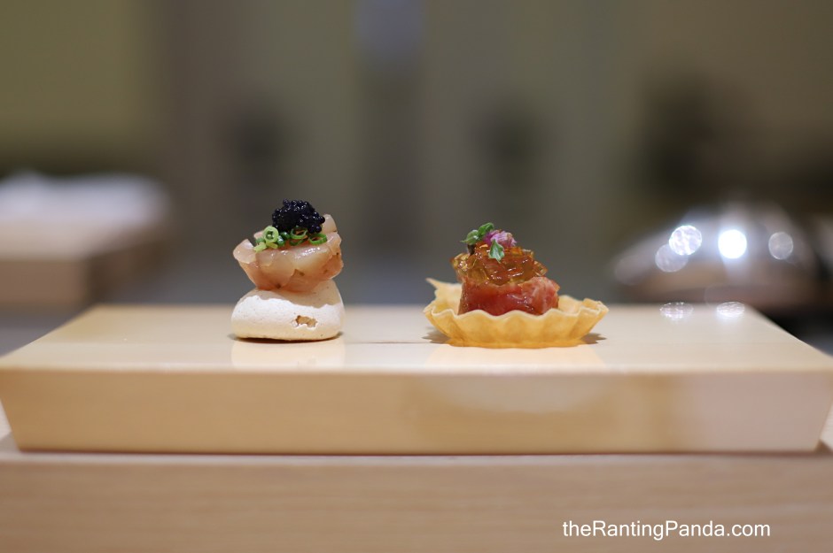 A duo of bites is showcased where I had Marinated Shiromi and caviar paired with an airy meringue, as well as a Chutoro Tart.
