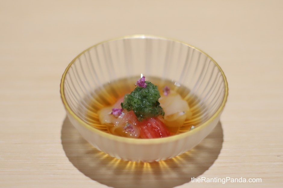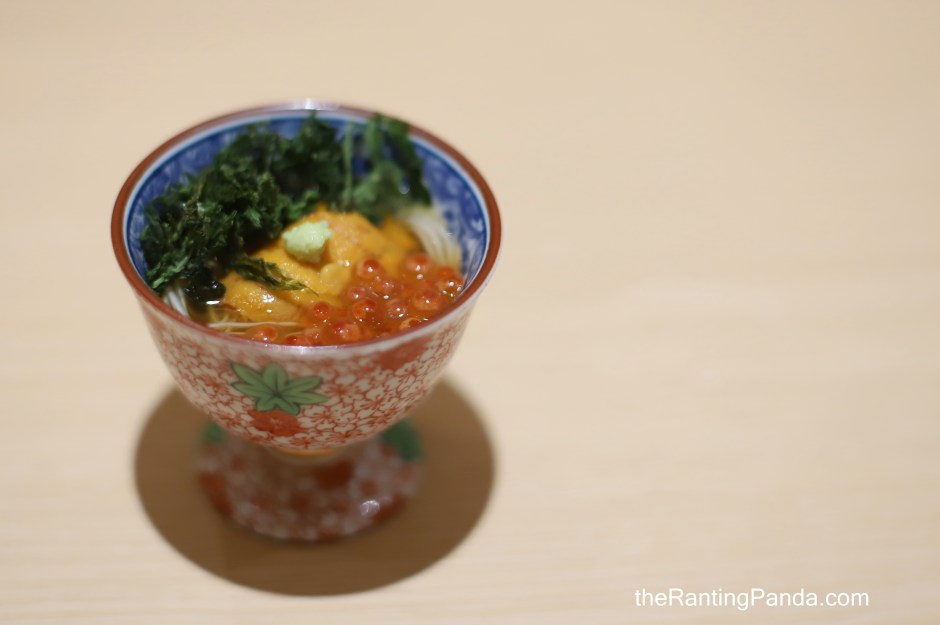 A course of fine arrowroot starch noodles in a light soup base topped with Ikura, Bafun Uni, and dried Nori (seaweed). It is an innovative take on somen as chef uses arrowroot starch instead of traditional wheat flour which is chewier.