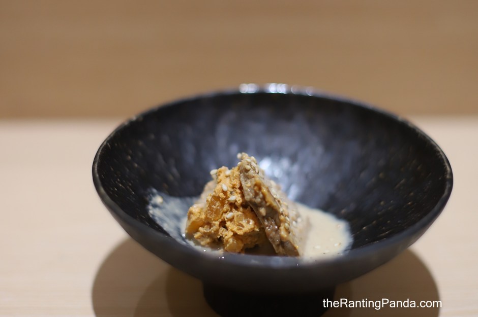 One of the current seasonal highlights is Ankimo (monkfish liver), prepared using Chef Chon’s secret milk-based technique. This is served in two forms—sliced and mashed— where the Ankimo is paired with a creamy goma (sesame) sauce and sweet persimmon.