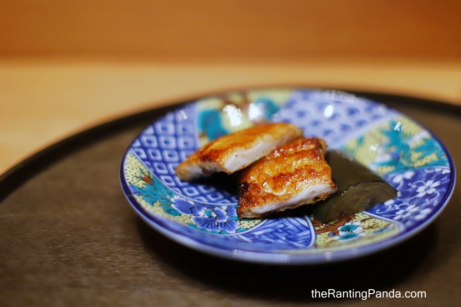 This is easily my favourite course of the meal – Charcoal-grilled Unagi (Freshwater Eel) from Ichi prefecture with Grilled Nasu (Eggplant) from Kochi prefecture. The unagi is perfect. The meat is fatty, while the skin is crisp. So good!