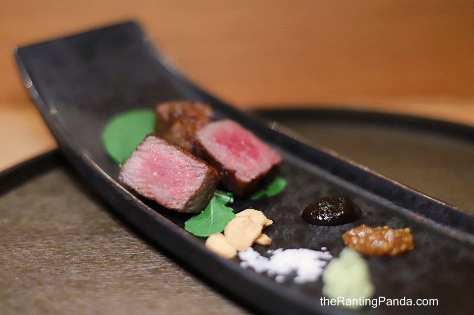 I was happy to spot a wagyu beef course on the menu and true enough, it lived up to my expectations. The charcoal-grilled and tender A4 Omi Wagyu (Sirloin) from Shiga is complemented with 5 different dips: Marinated Red & White Miso, Snow Salt, freshly grated Wasabi, Sweet & Spicy Marinated Barley and Crisp-fried Garlic Slices. Non beef eaters have the option to swap out for Grilled Buri.
