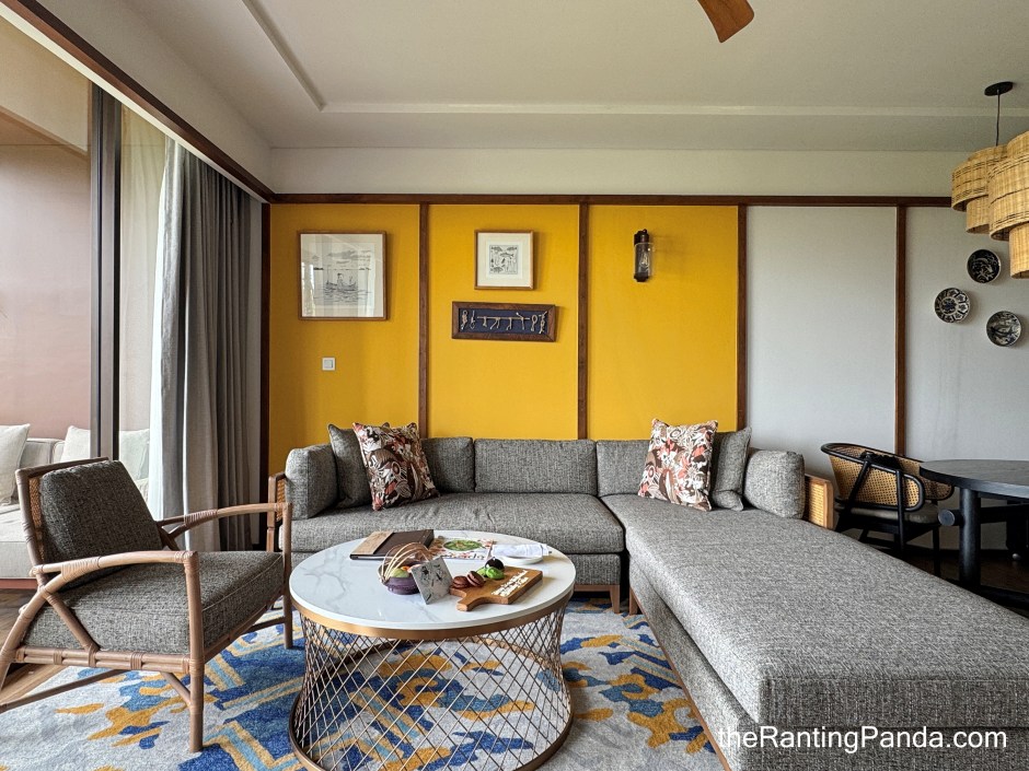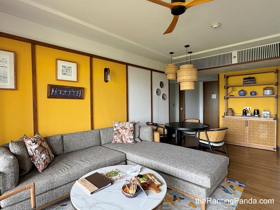 In terms of the layout of the suite, there is a living room space upon entering the suite where you get a spacious dining table and living zone with comfortable sofa, along with a big television screen.