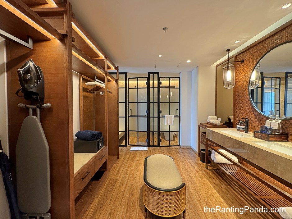 Double vanity sinks, spacious walk-in shower, a dressing table, ample open concept wardrobe space, and an ottoman in the middle of the bathroom if you need to take a rest!