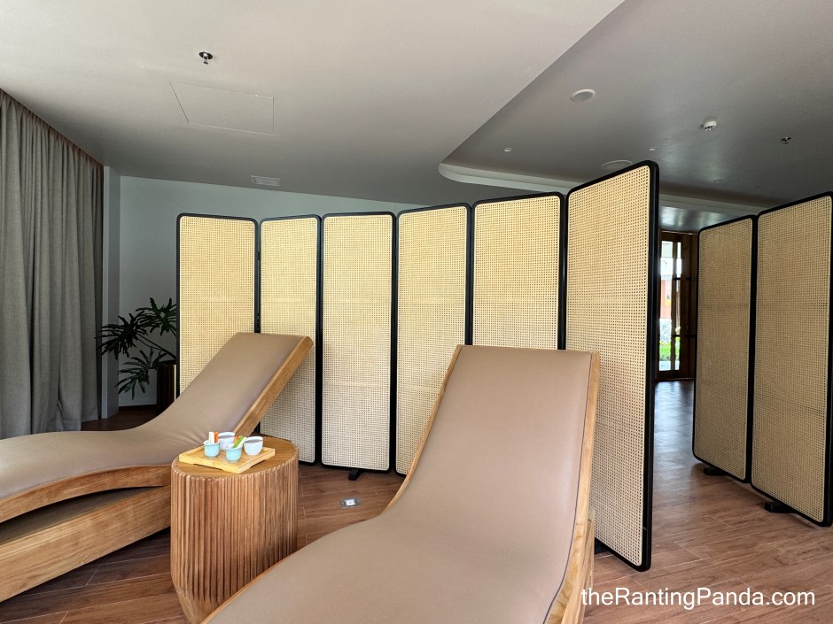 The spa facility features three single treatment rooms, two couple treatment rooms with attached bathtubs, a reflexology and beauty lounge, and a dream pod room.