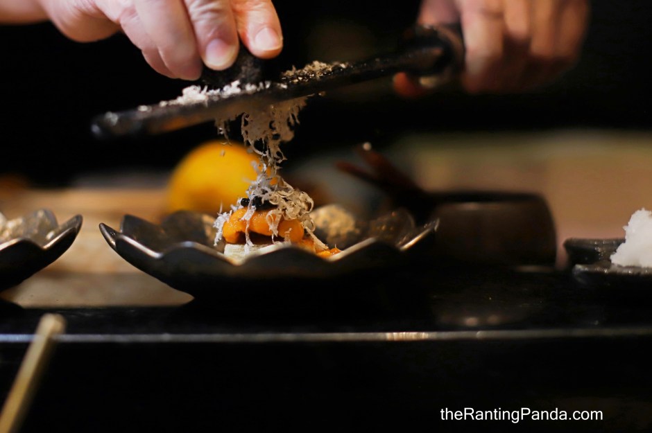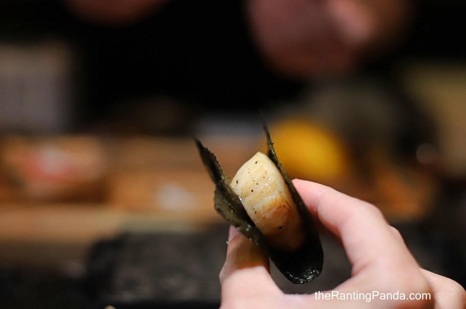 The sashimi grade scallop is torched with binchotan, then wrapped in freshly grilled seaweed.