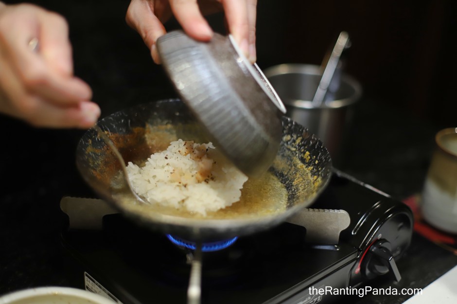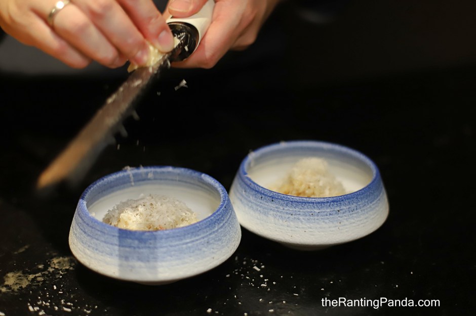 The last savoury course uses the base of the hot pot to prepare the Uni Risotto where diced lotus root is mixed in the Japanese rice, before being topped again with more uni and shavings of parmesan.