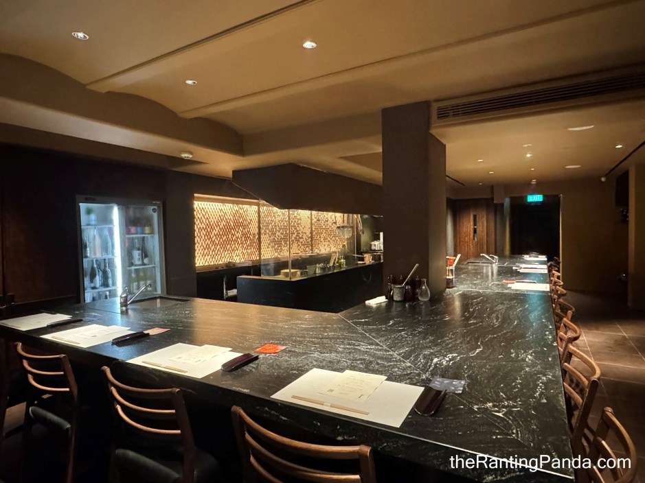 The space of Morita Unigoro takes on a L-shaped counter seating with a dim dining ambience.