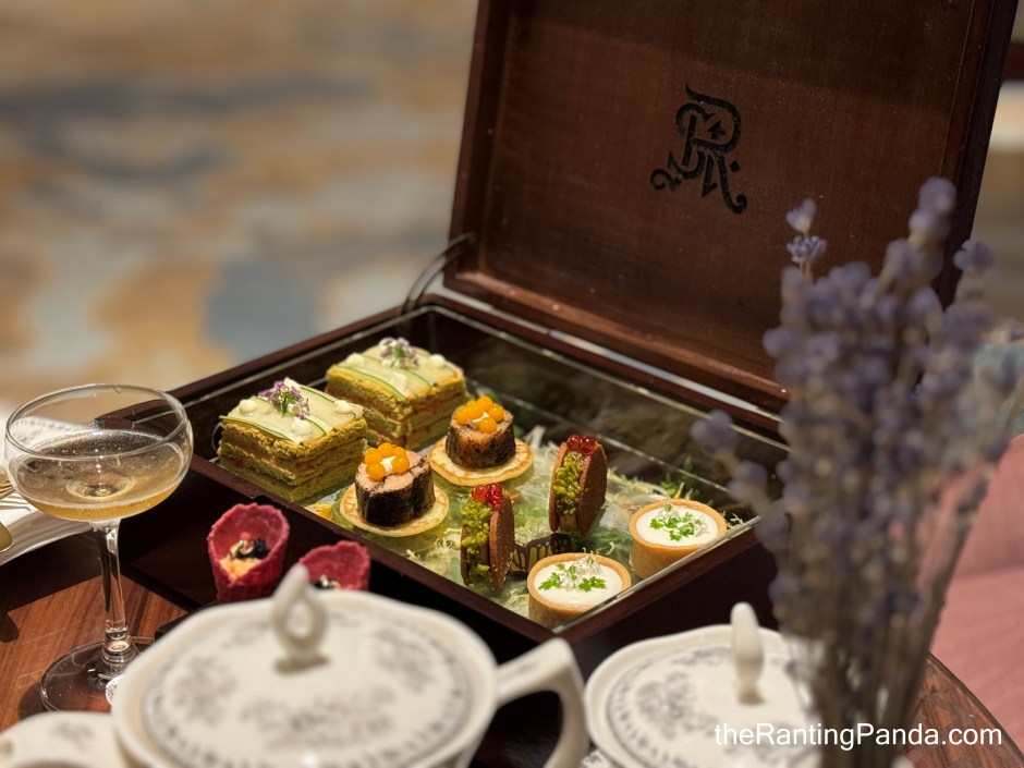 The first part of the experience is where the savouries are being presented in a wooden box – Foie Gras Terrine, Shortbread, Raspberry Caviar; St. Regis Tea-Infused Salmon Mosaic, Cream Cheese, Mango Pearls; Goat Cheese Tart, Elderflower, Chervil (V); Cucumber & Tomato Hummus Sandwich (V); and Prawn Mousse, Beetroot Cone, Avruga.