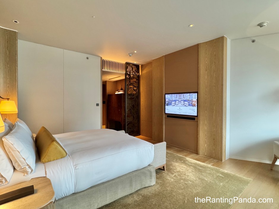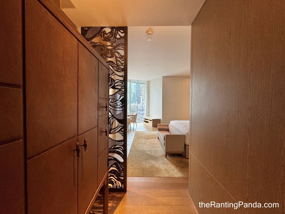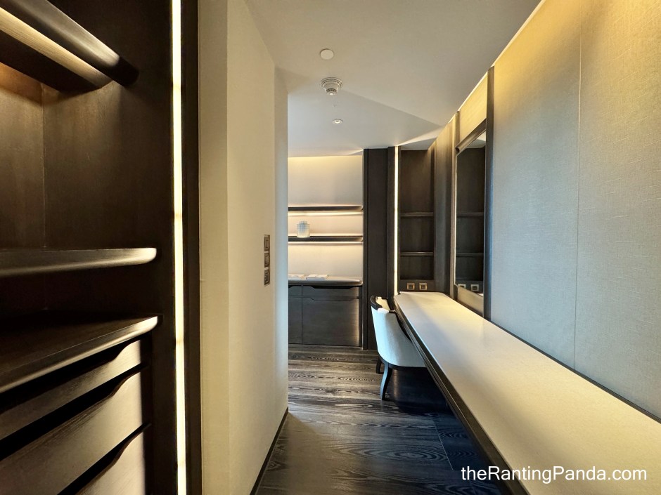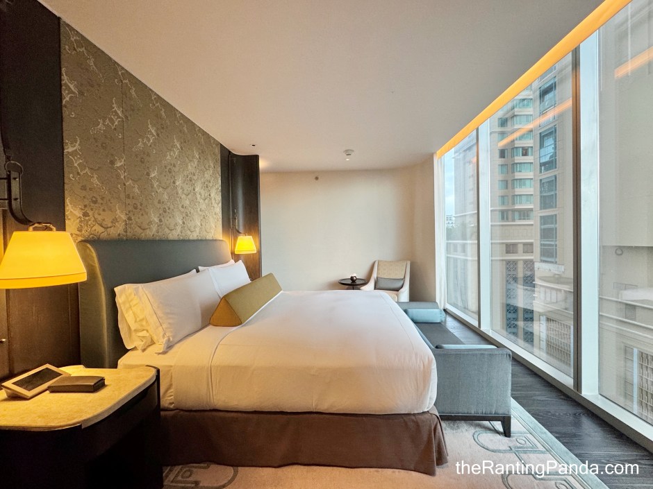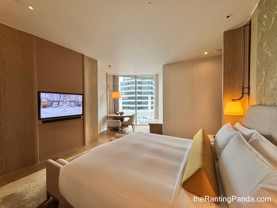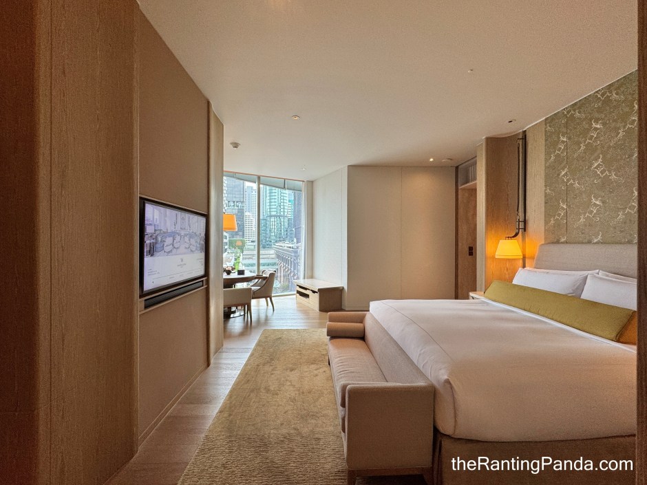 Upon entering the room, there is a spacious walkway including the minibar corner. A work desk is located beside the window, and the overall vibe is very elegant and cosy. The window is not that big, and one point to note about the Waldorf Astoria Bangkok is that the building is curved.