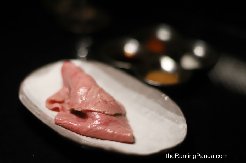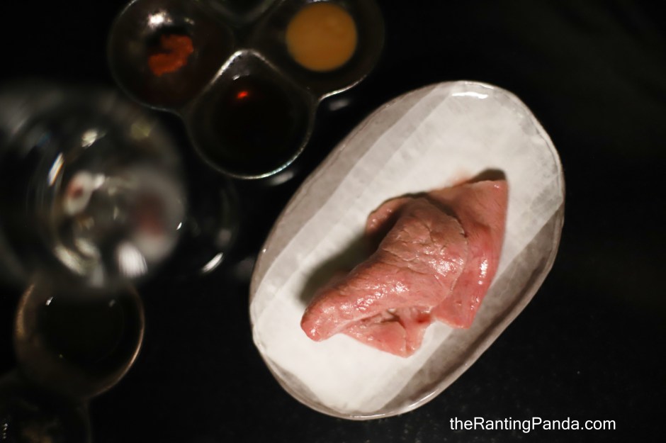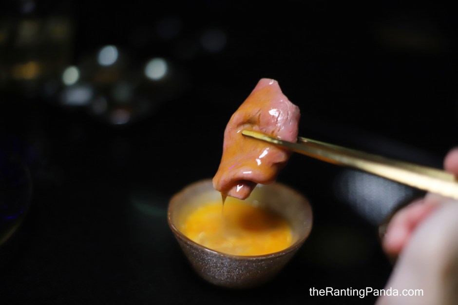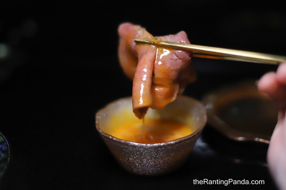Raw egg yolk is served to dip the wagyu beef.