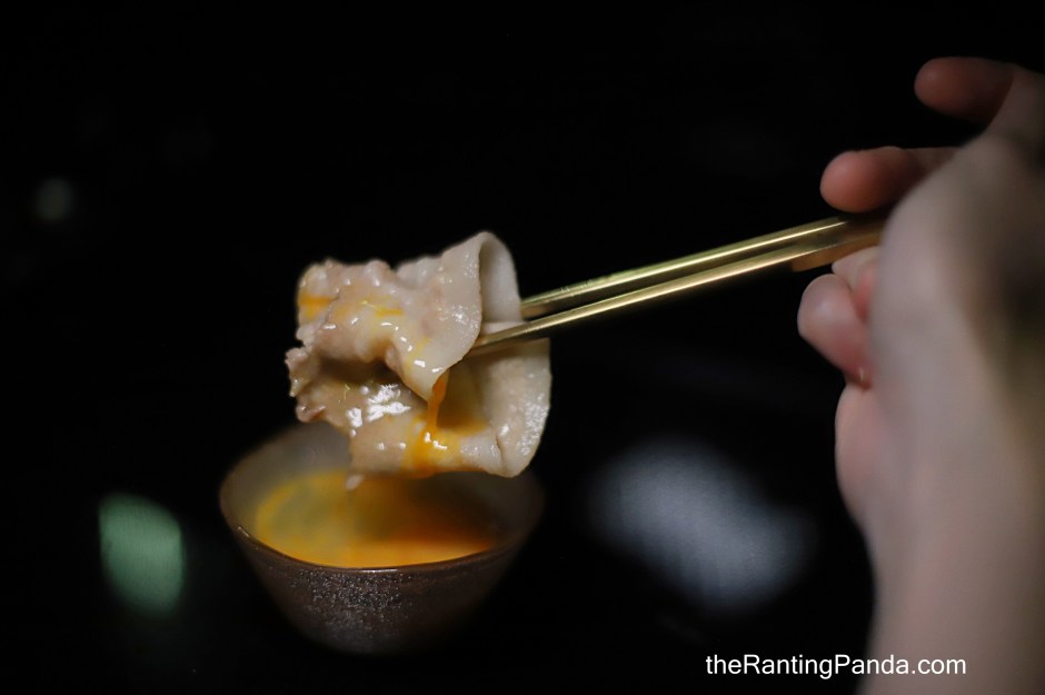 Raw egg yolk is served to dip the pork belly.