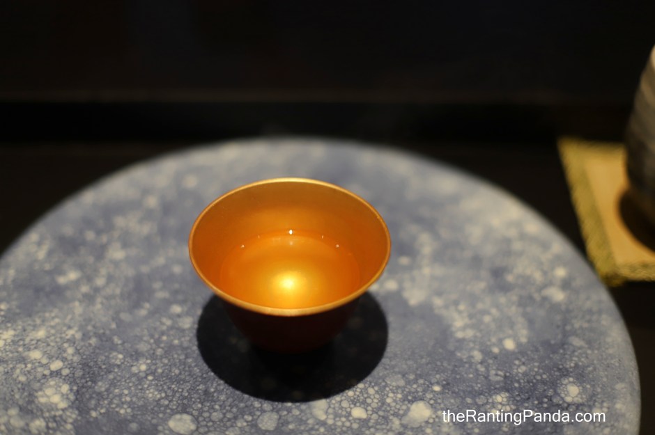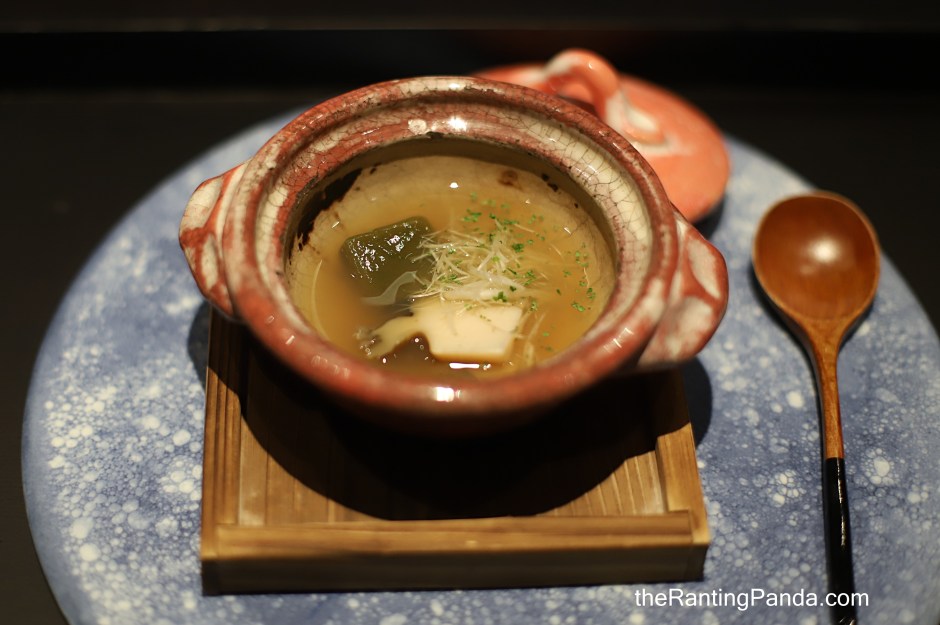 A welcome bowl of clear dashi soup to kickstart the meal.