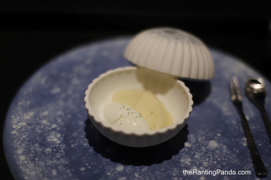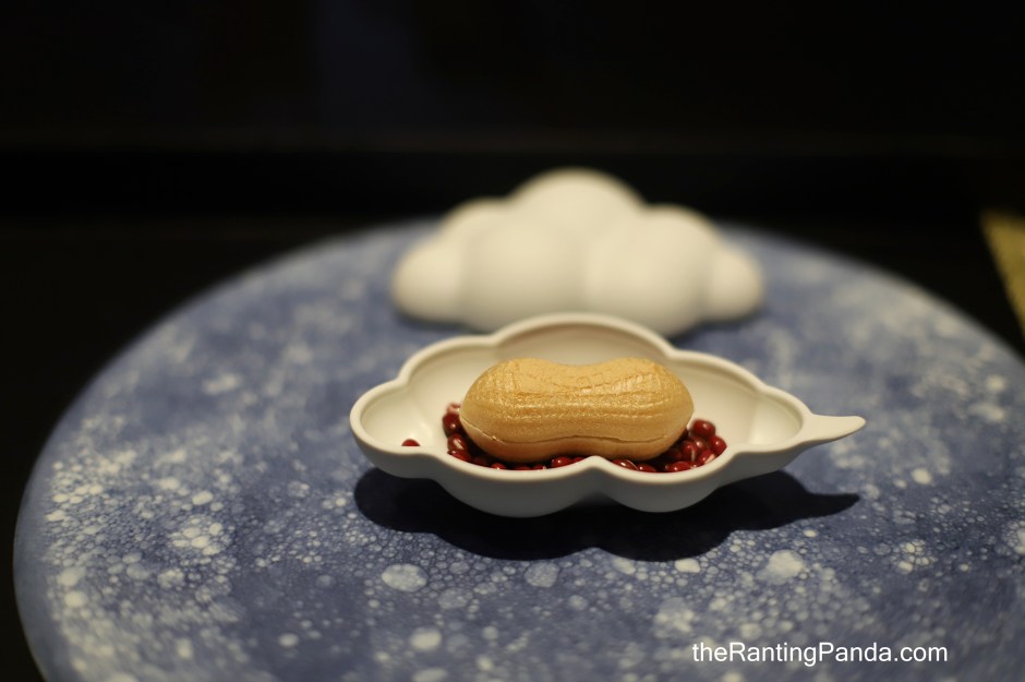 A peanut-shaped monaka is served next. The creamy monaka is filled with foie gras as an ode to the peanuts traditionally served in Singaporean Chinese restaurants.
