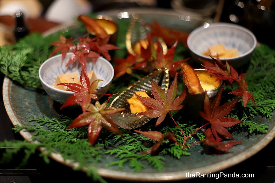 A beautiful garden platter made up of a trio of Ankimo (monk fish liver), seaweed with Uni and Corn soup with fish roe.