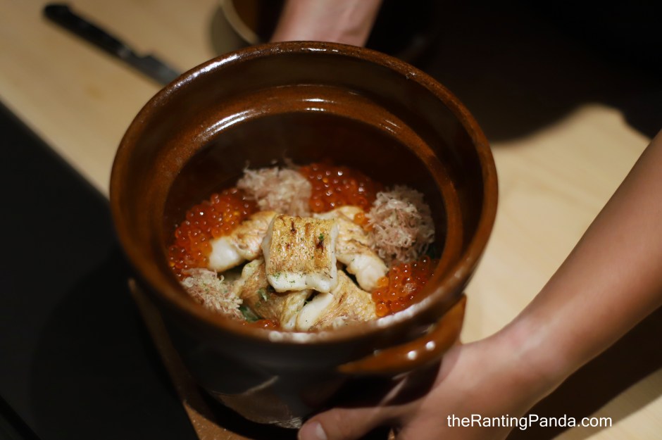 The protein with the donabe varies by season and the rice used is a special rice blend from Sumidaya Shoten in Tokyo. It is delicious but not too heavy on the palate where Chef taro also uses ikura cured in his own blend of dashi and soy sauce.