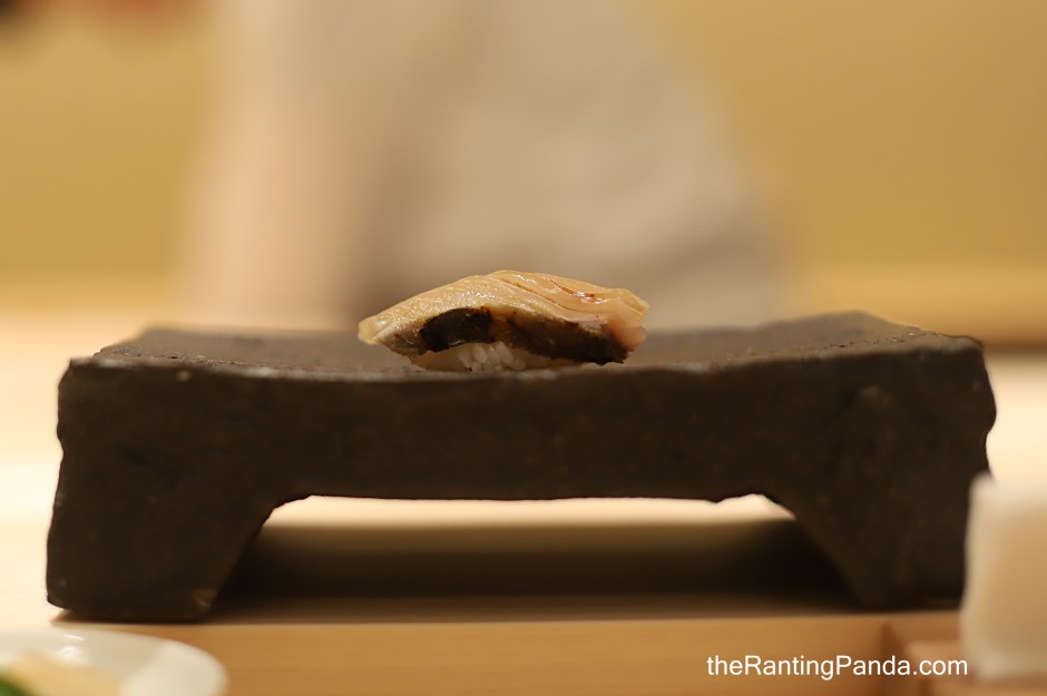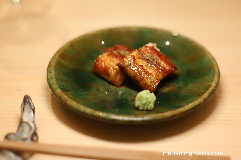 Topped with Sansho pepper, the ultra-crisp skin of the unagi is glistening. Good on its own, or even with a tinge of the fresh wasabi.