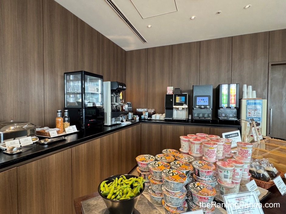 The Food Now, let’s talk about the food. The buffet is located near the entrance and, frankly, it is not the lounge’s strongest feature. Expect the likes of fried chicken, grilled rice balls (onigiri), instant noodles, fried yakisoba, soft pretzel dogs, edamame, potato chips, and scones.
