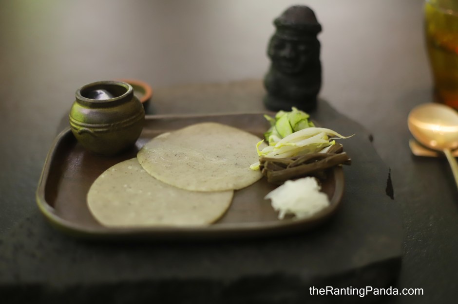 The next appetiser is the Bingtteok (Jeju Buckwheat Crêpe) – a DIY course to warp all the condiments like salad into the buckwheat crepe.