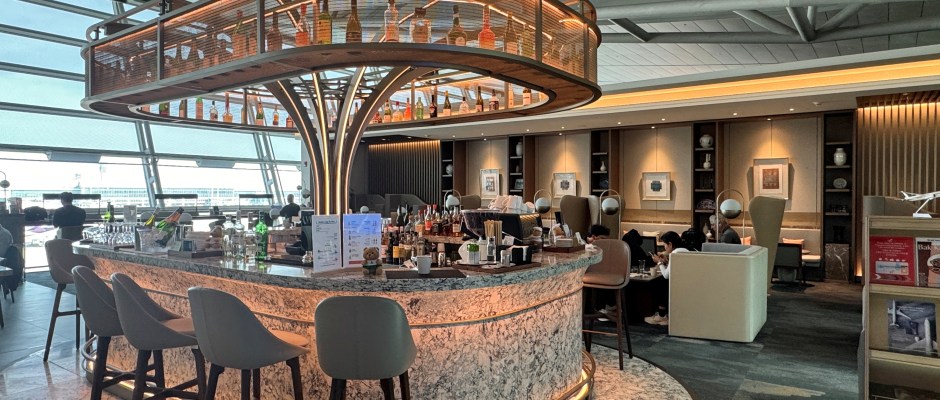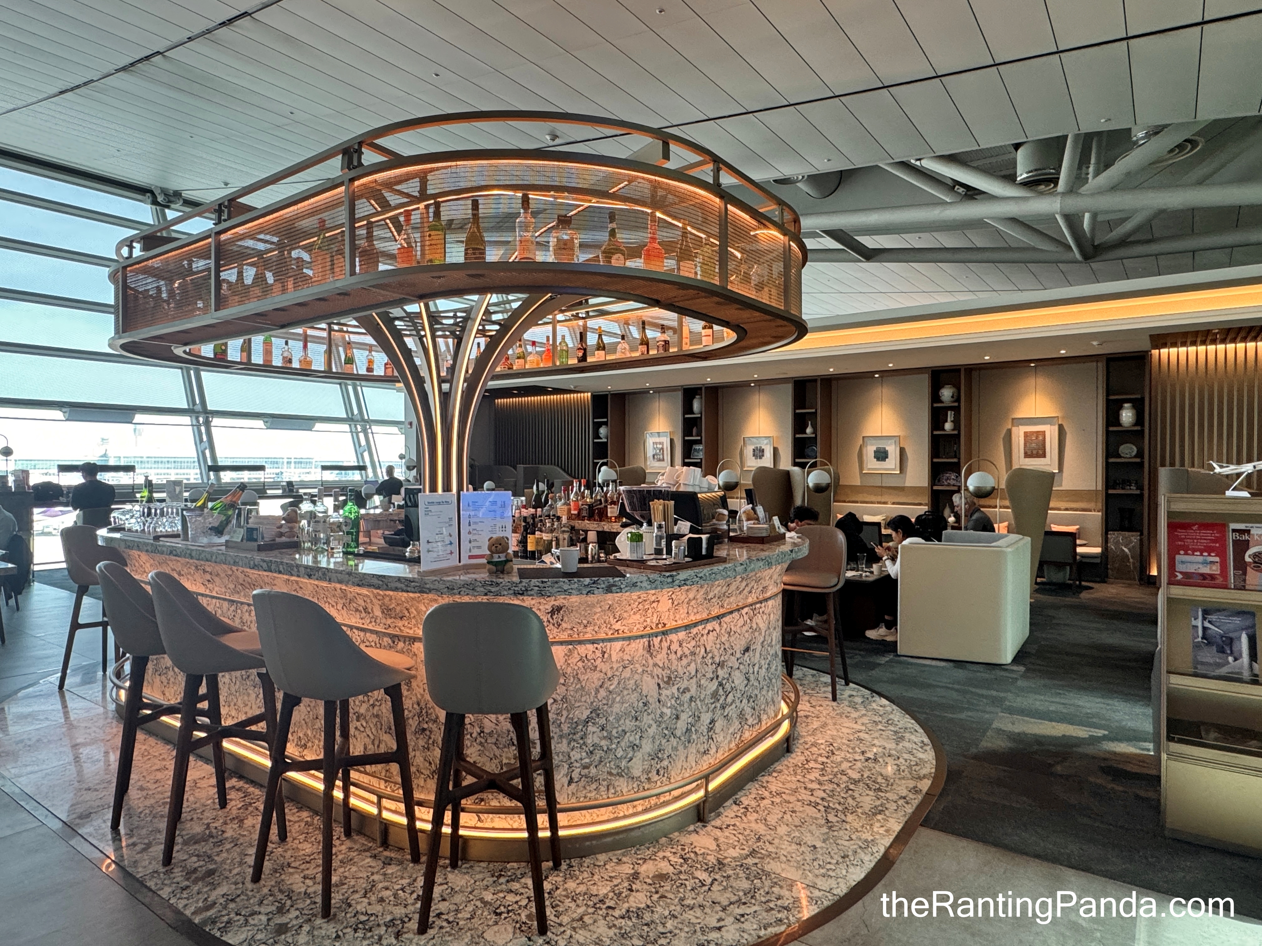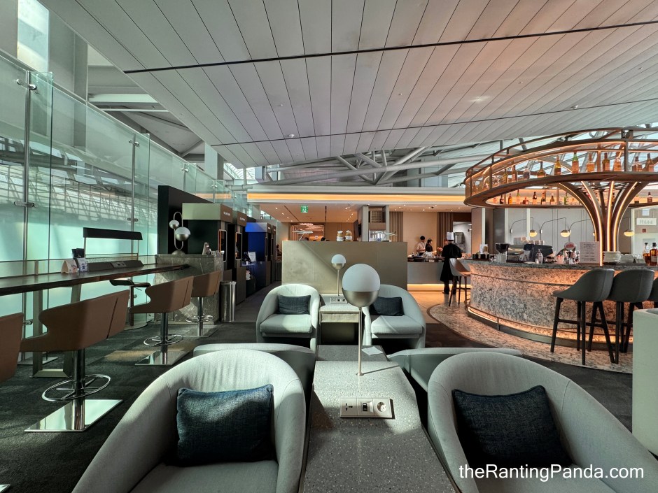 Floor‑to‑ceiling windows make the space feel far less claustrophobic than many airport lounges, and the layout flows logically between dining, lounging, and bar areas.